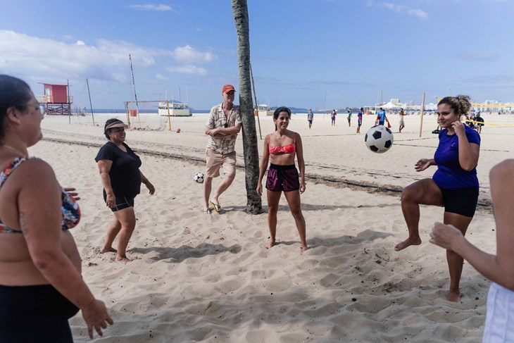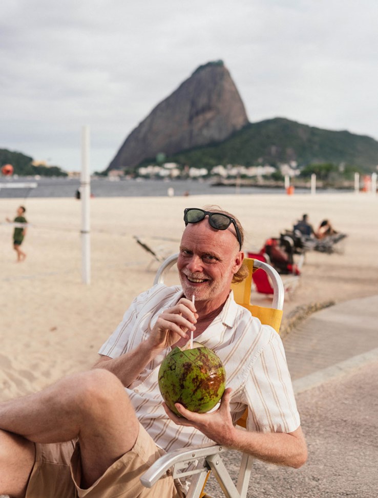 Lite regn får oss att stanna till under ett uppspänt tält på stranden där beach-volleyboll spelas till hög och pulserande musik. En regnbåge över horisonten, Sockertoppen framför oss med linbanan som gått fram och tillbaka sedan 1912. Det är 29 grader varmt och Henrik har jobbat hela dagen, inte varit ute förrän nu. Han drar in syret djupt i lungorna och njuter. De ljumma regndropparna är verkligen inget problem för en som kommer från södra Sverige, men ”brasilianare klarar inte av regn”, så den försäljare som Henrik vanligtvis köper kokosvatten av här, är inte på plats. Vi får gå tillbaka in till favoritförsäljaren i Flamengo för att släcka törsten. Jag får fler tips. Botafogo är ”skitkul, finare och säkrare numera, men fortfarande funky”. Copacabana får tummen upp, men Ipanema gillar han inte. Där bor ”överklass och rasism, Bolsonaro-anhängare”. Rika som inte vill förändra Brasilien till det bättre. I Ipanema blir han själv fördomsfullt tilltalad på engelska och hans ex-fru som är svart betraktad som prostituerad.