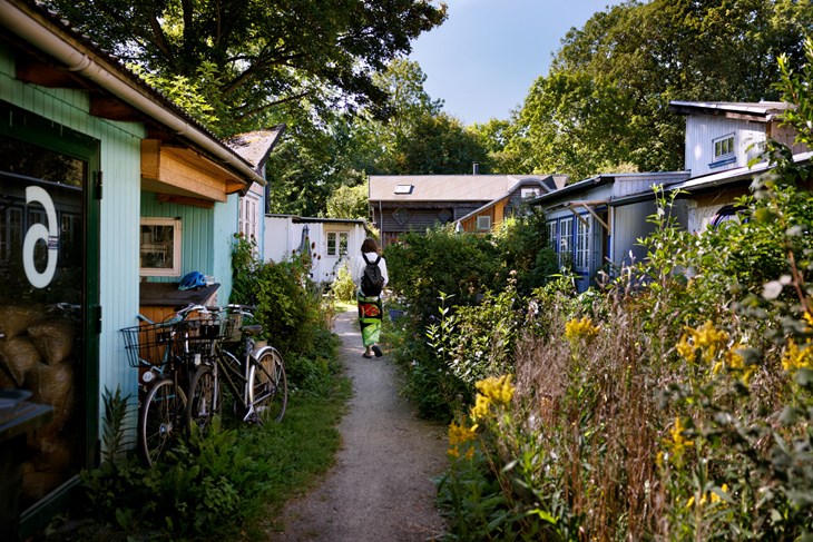 Det är morgonrusning i Köpenhamn. Cyklisterna tar vägen genom Christiania, svischar förbi de boende som tar dagens första cigg i sina trädgårdar. Här bor 900 christianiter uppdelade i 15 olika områden. Det finns förskola och fritids, ”sundhetshus” dit läkare och sjuksköterskor kommer varje vecka, bastu, bio, ett stall med 20 hästar, barer, restauranger, butiker och platser för skapande. Inget hus är det andra likt, men färg och växtlighet är röda trådar.
